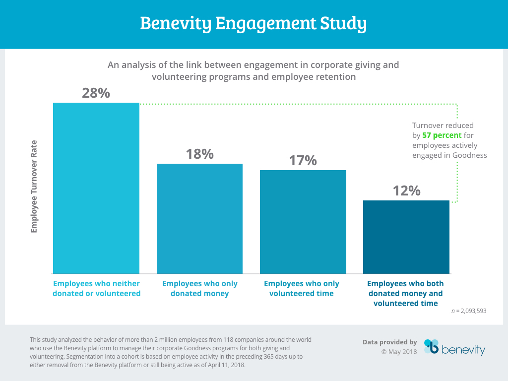 Corporate volunteer activities are some of the most impactful ways to demonstrate company values in action. Benevity’s 2018 Engagement Study found that actively engaging in volunteering and donating reduced employee turnover by 57%[6]. It affirms employee interests and boosts the reputation of the company in the local community. Singular causes or organizations lose their relevance, however, when employees are distributed across the map.